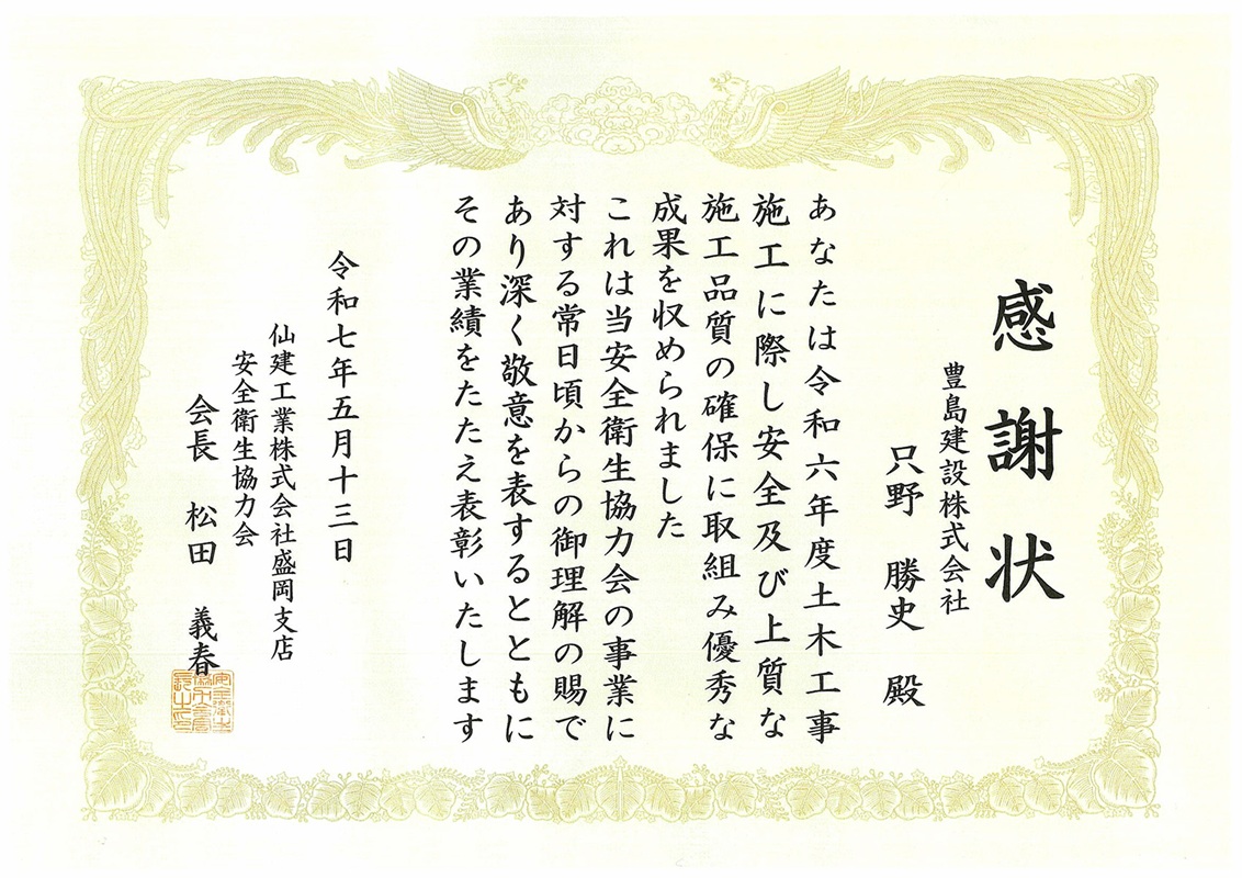 仙建工業㈱盛岡支店 安全衛生協力会会長 松田義春様より只野勝史(個人)