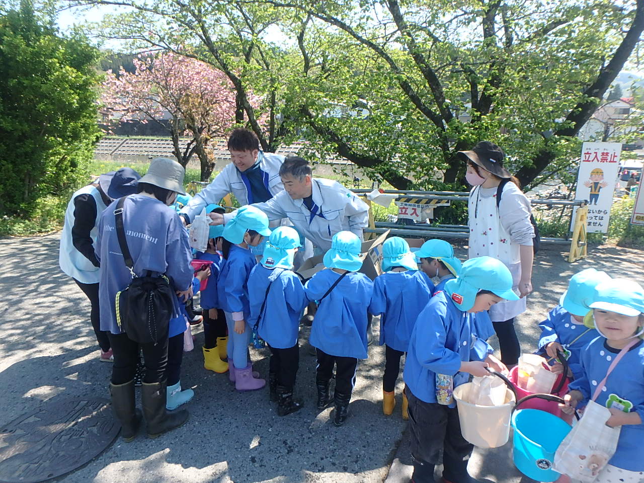 同日は、住田町世田米の河川敷で、世田米保育園の園児を招いての放流も行われた。